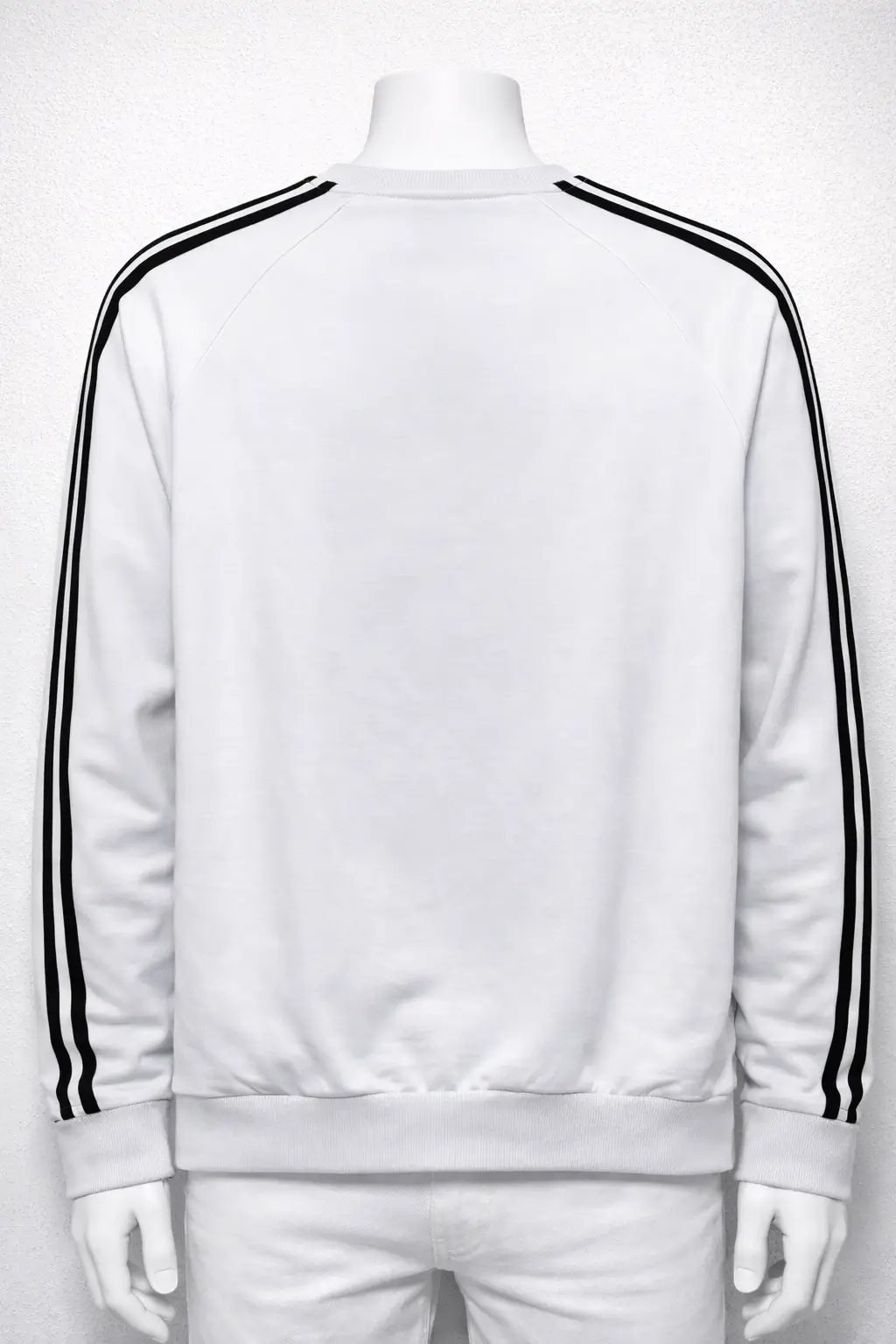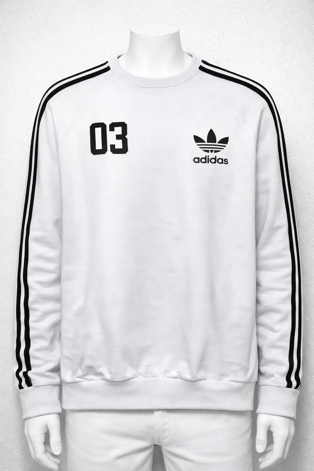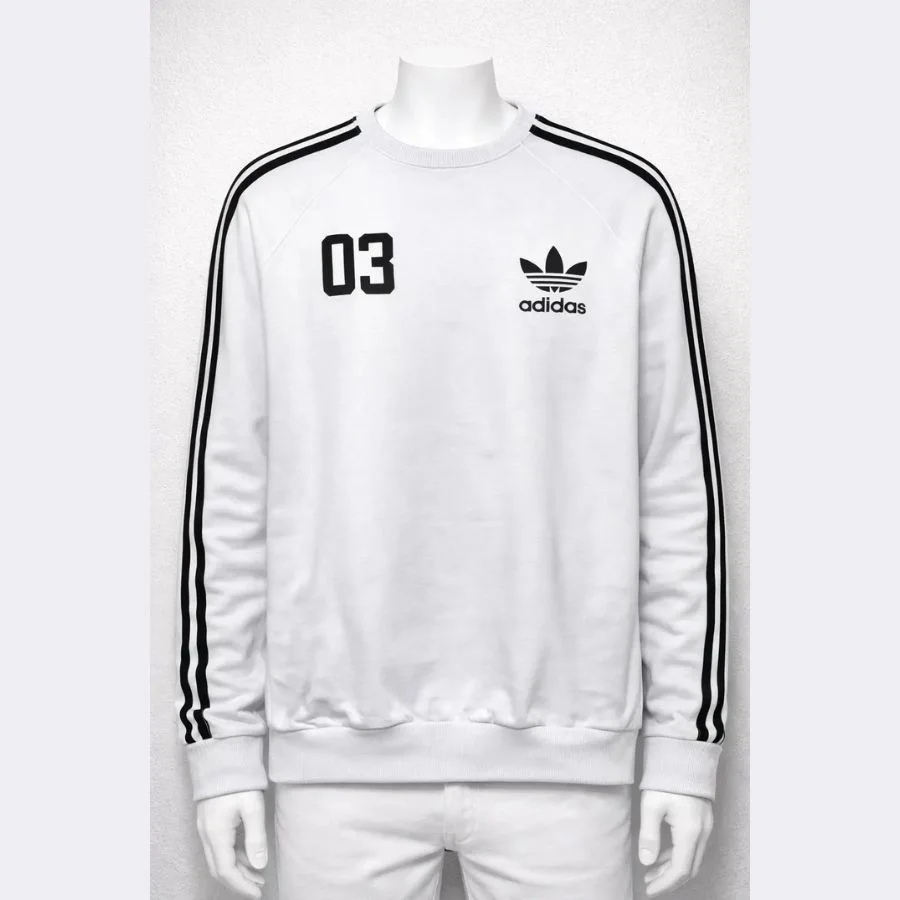 ADIDAS Long Sleeve Sweatshirt comes in a clean white color. It gives a sporty and timeless look. It has a black Adidas Trefoil logo and “03” print on the chest. It features black shoulder stripes for a retro style. It is made from soft fabric for all-day comfort. It has a classic crew neck design. It is original and used but clean, with sharp prints and color.