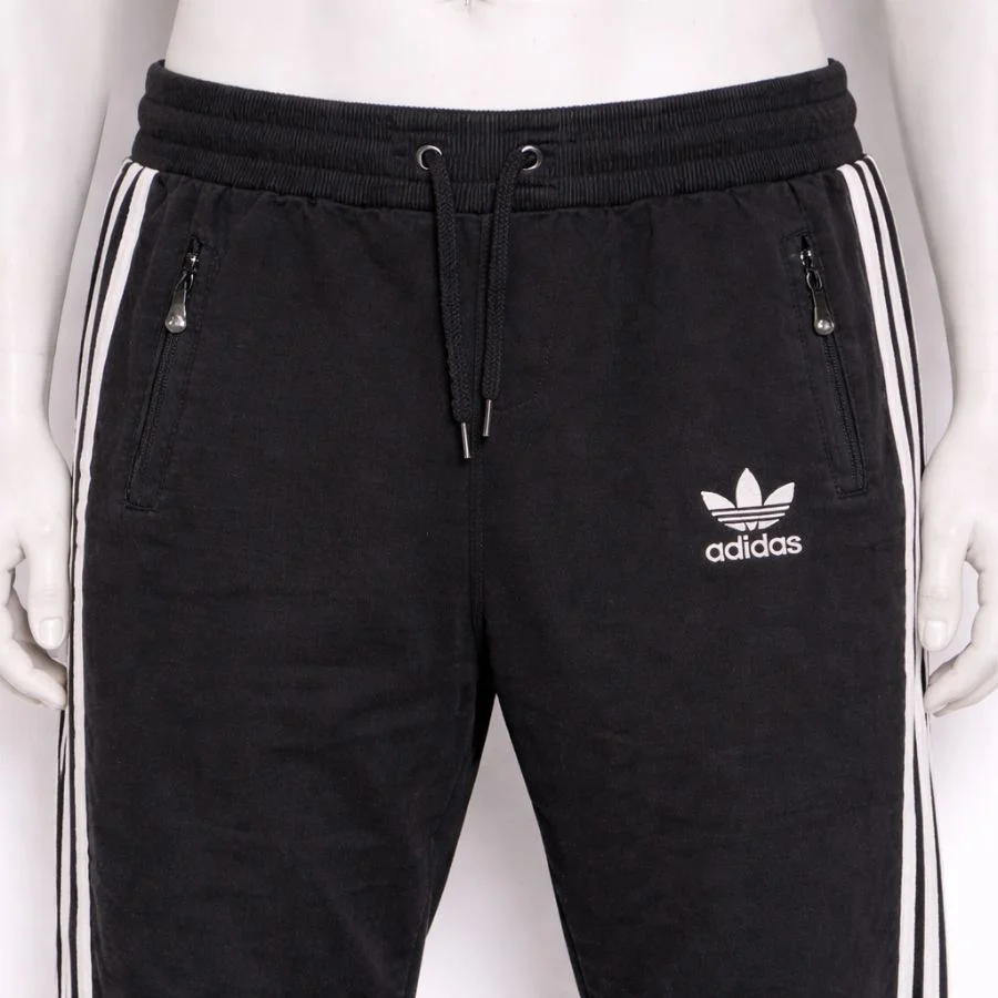ADIDAS Men’s Track Trousers are black with white side stripes. It has an elastic waist with a string for good fit. It has a slim shape with ribbed bottoms. It is original and used but clean. It is good for gym, going out, or relaxing at home. It looks nice with hoodies or t-shirts.