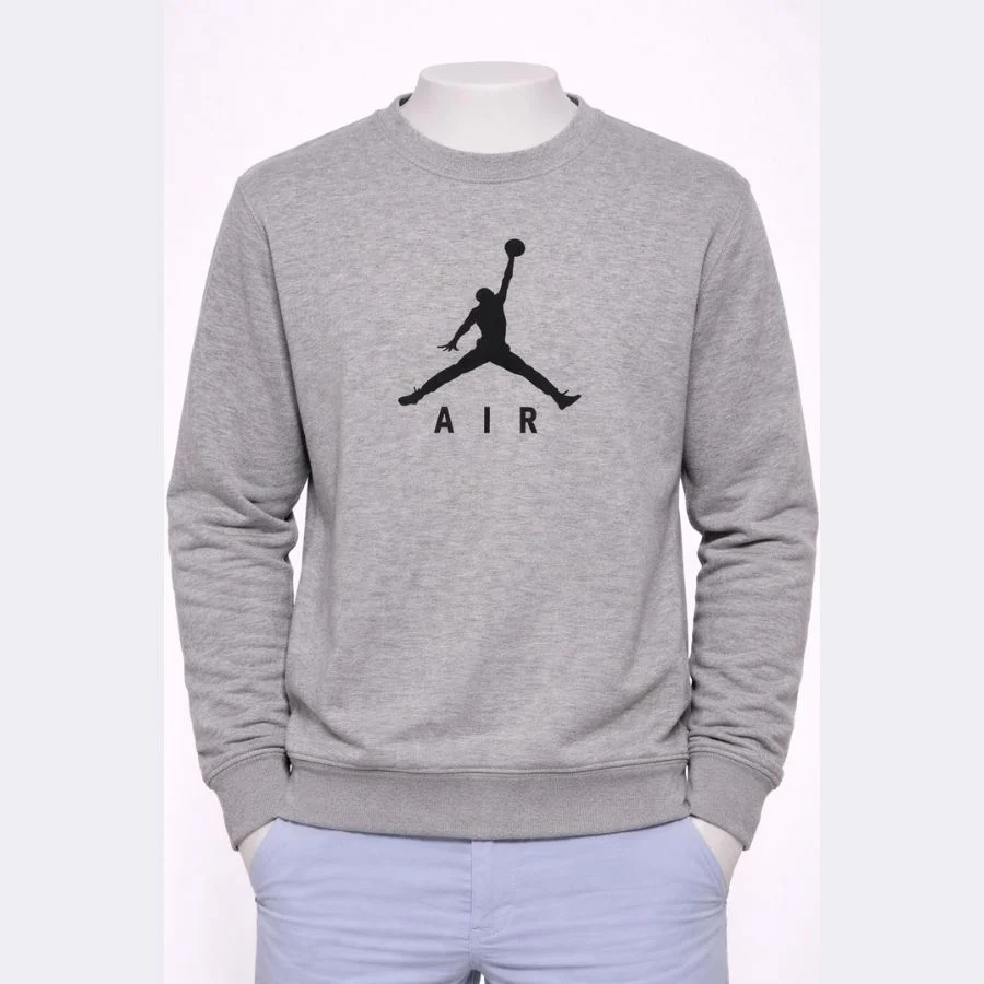 This is an Air Jordan men’s crewneck sweatshirt in large. It comes in a grey color. The Jumpman logo with AIR is on the front. The fabric feels soft and comfortable. It is good for daily wear and casual outfits.