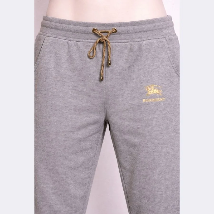 BURBERRY Grey Sweatpants are stylish and comfortable. It has a classic grey color for lounging. It includes a drawstring for a perfect fit. It has two pockets for daily use. It features a premium embroidered logo. It is used but clean and soft. It combines luxury with a relaxed fit.