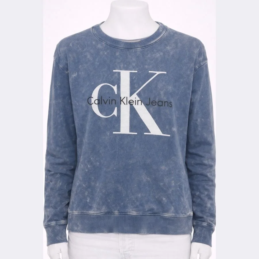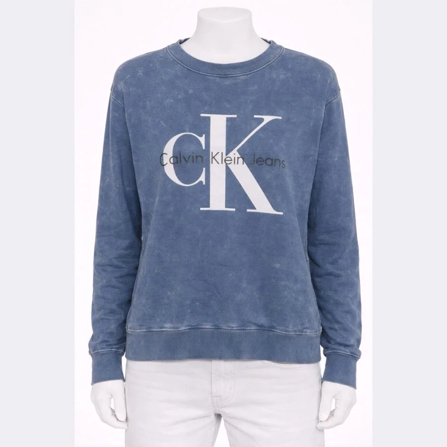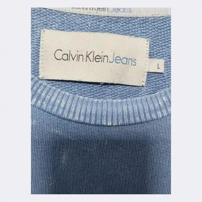 This is a Calvin Klein men’s crewneck sweatshirt in a large size. It comes in a washed blue color. The large CK logo is on the front. The fabric feels soft and comfortable. It is good for everyday wear and casual use.