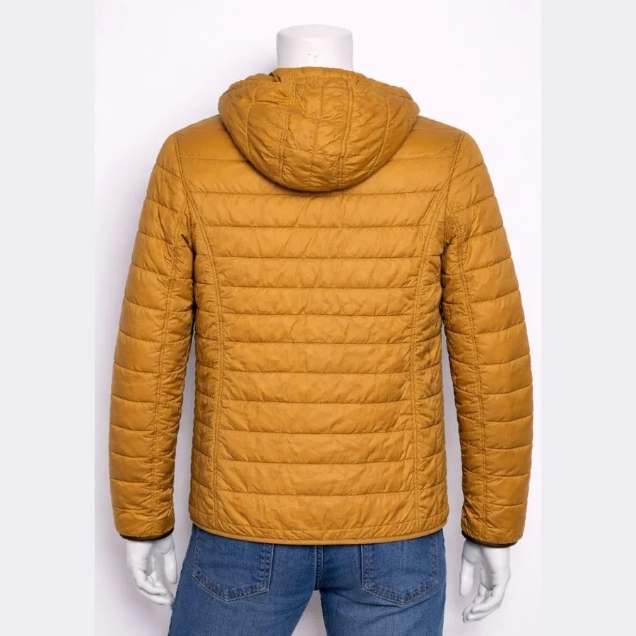 This Mustard yellow jacket with a clean and modern style. It has light padding and a hood for cold days. It features a strong front zip and side pockets. It fits perfectly without looking too heavy. It has authentic brand quality in a fresh. It looks great with jeans for any casual trip.