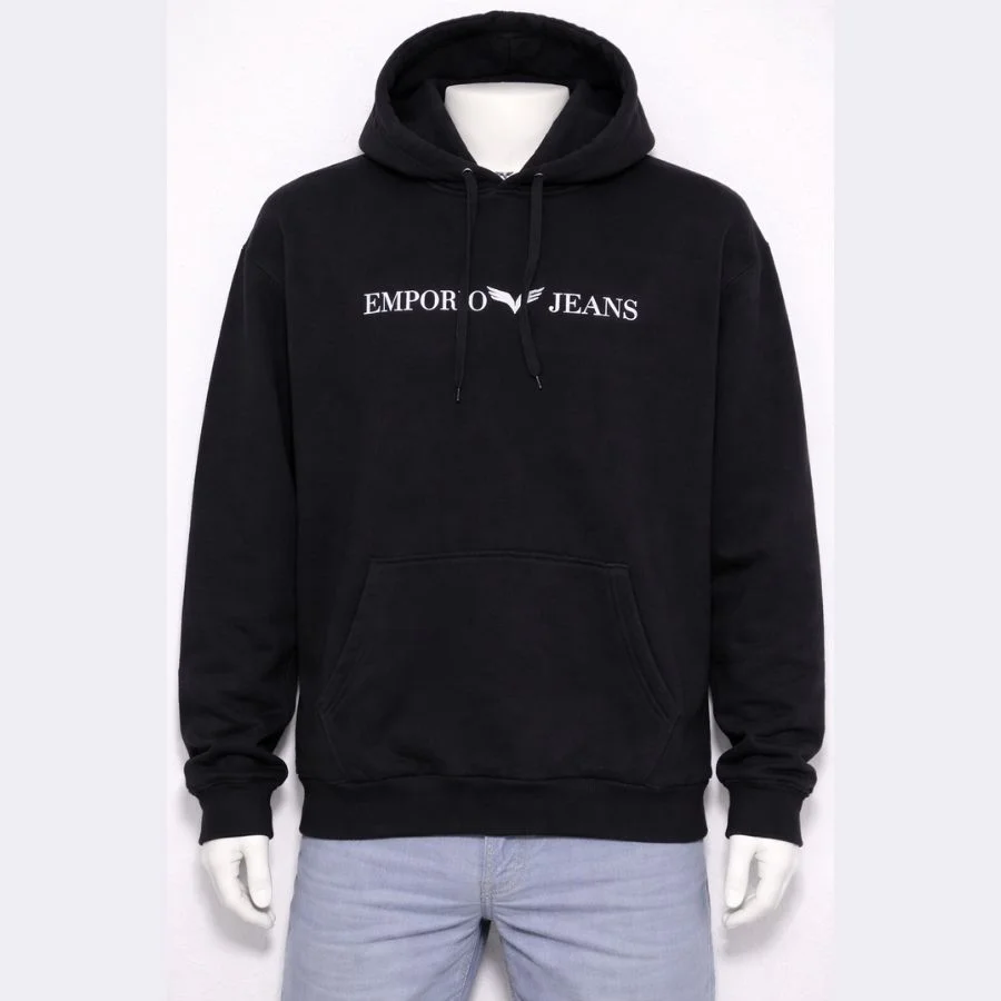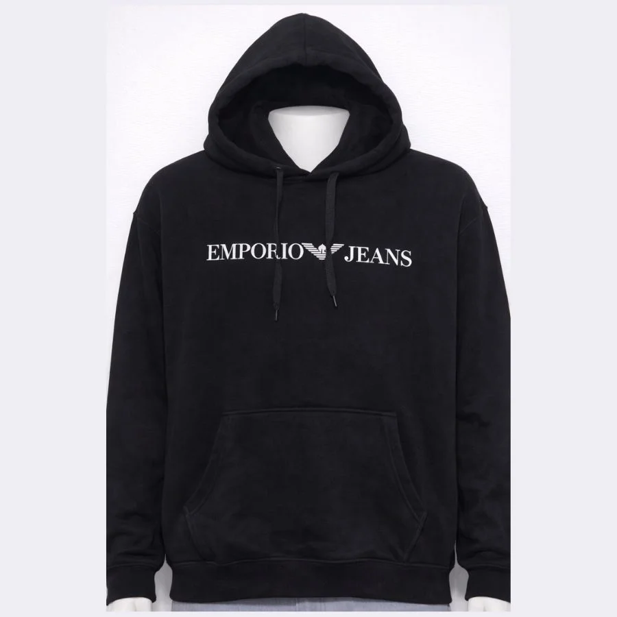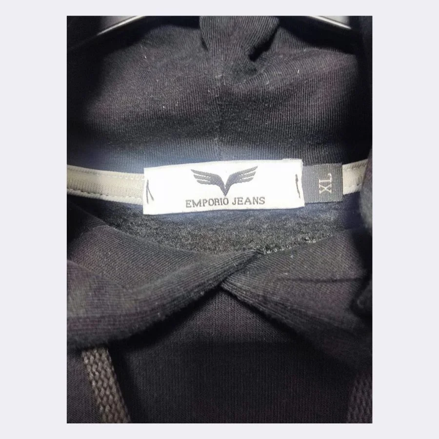 This EMPORIO JEANS men’s logo hoodie has a clean and smart style. It features a simple white logo on the front and a warm hood. The material is soft and very comfy for daily wear. It shows a little bit of use but still looks really good. It looks great with jeans or joggers.