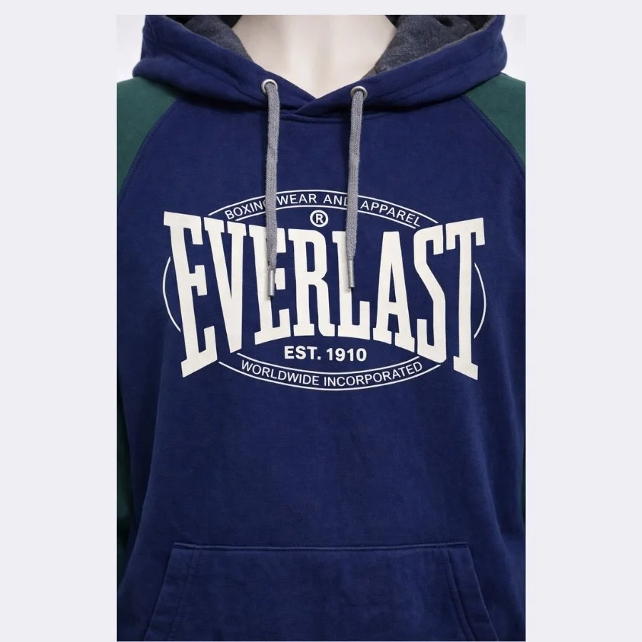 This Everlast hoodie is sporty with a navy blue body and green sleeves. It has a soft hood, adjustable strings and a front pocket for comfortable. The inside is soft and keeps you warm. You can wear it for workouts and casual outings. A simple hoodie with a classic sporty fashion.