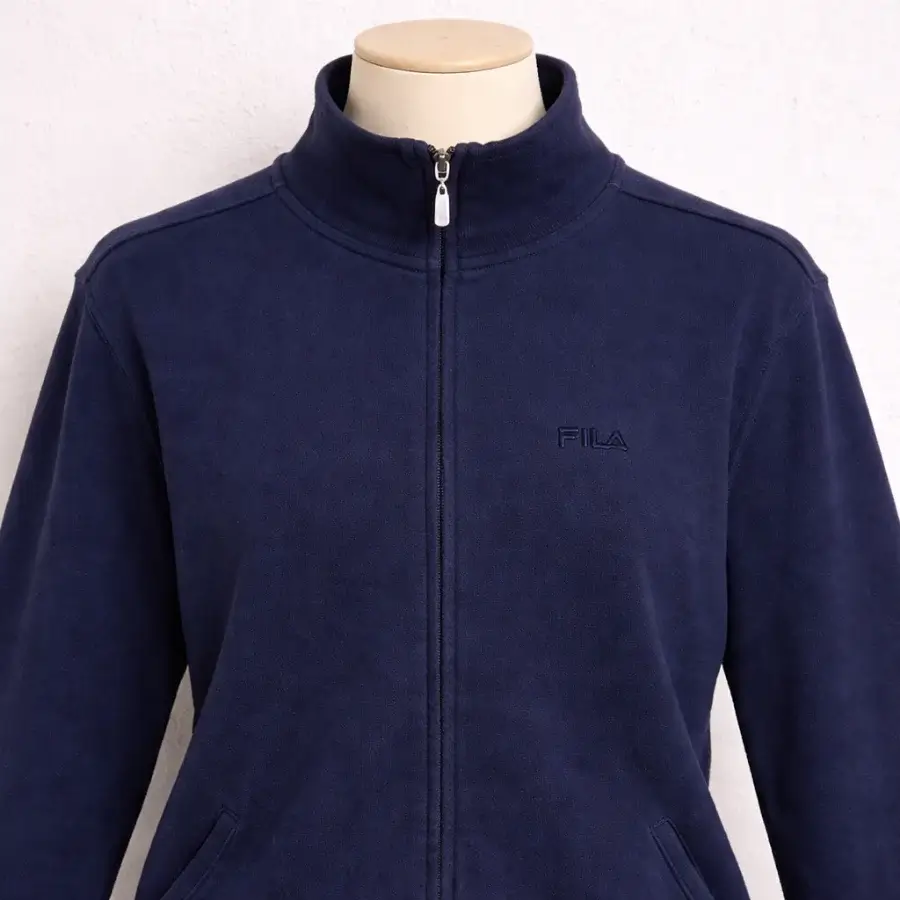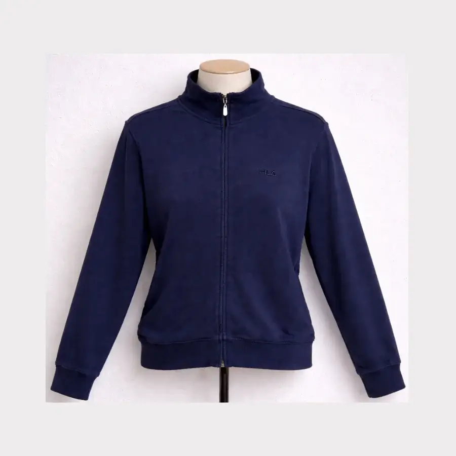 This FILA Men’s Full Zip Blue Jacket is a navy blue jacket with a sporty look. It feels soft and comfy to wear. It has side pockets for small things. It has a full zip for easy wear. The cuffs and waist fit well and feel comfy. It is original and used but clean, with the FILA logo clear. It is good for workouts, walks, or daily use.