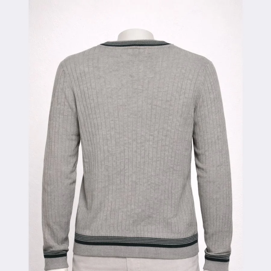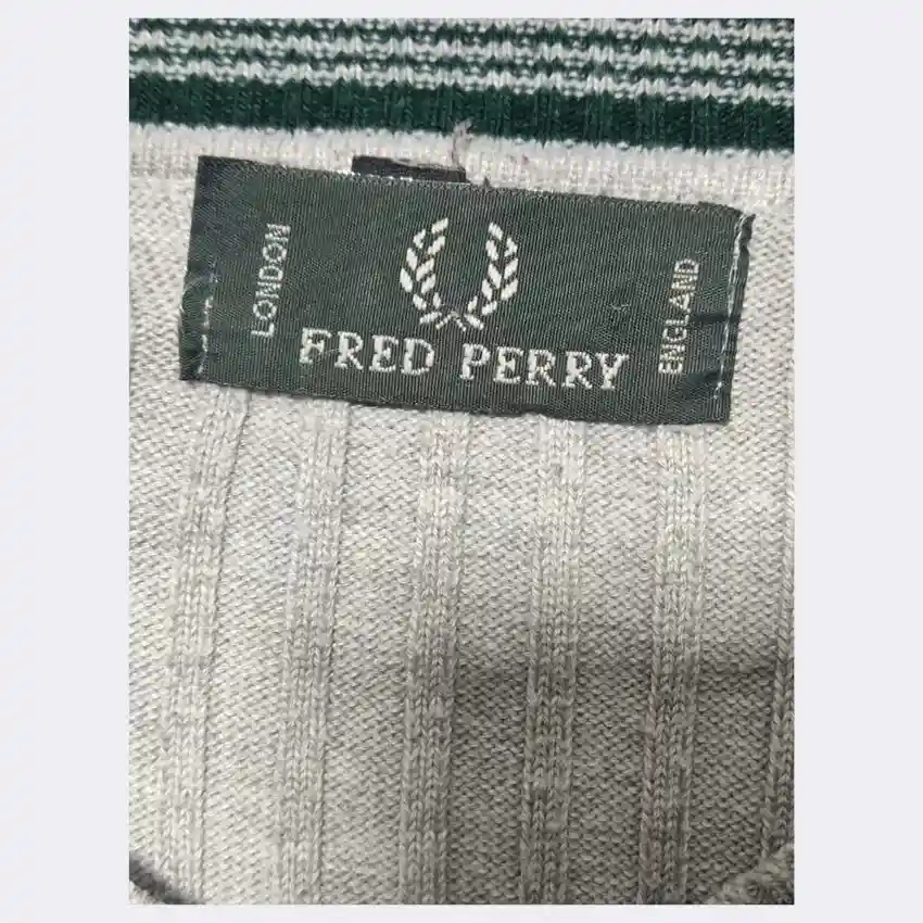 FRED PERRY Men’s V-Neck Sweater comes in a clean grey color. It has a timeless British style. It features green trim on the neck, cuffs, and hem. It has a fine ribbed knit texture. It is made from soft cotton knit fabric. It feels comfortable for all-day wear. It is original and used but clean.