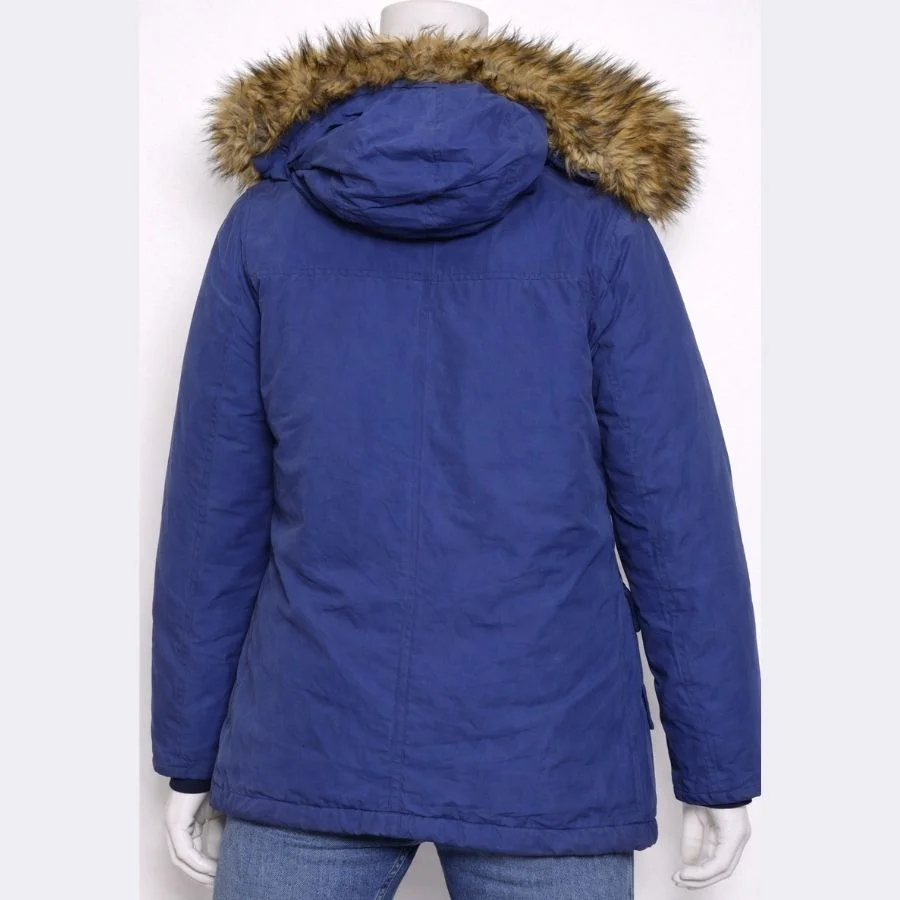 This is a FREEDOMDAY women’s hooded jacket in medium size. It comes in a rich blue color. The hood has fur for extra warmth.