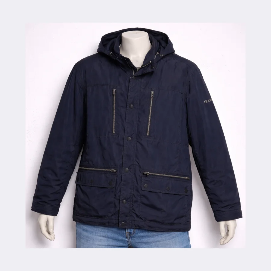 This Geox men’s hoodie jacket is cozy and stylish. It comes in navy blue and has a hood to keep you protected. It has a front zip and buttons for easy wear. It has pockets to keep your essentials. Great for everyday use, outdoor activities or heading to work.