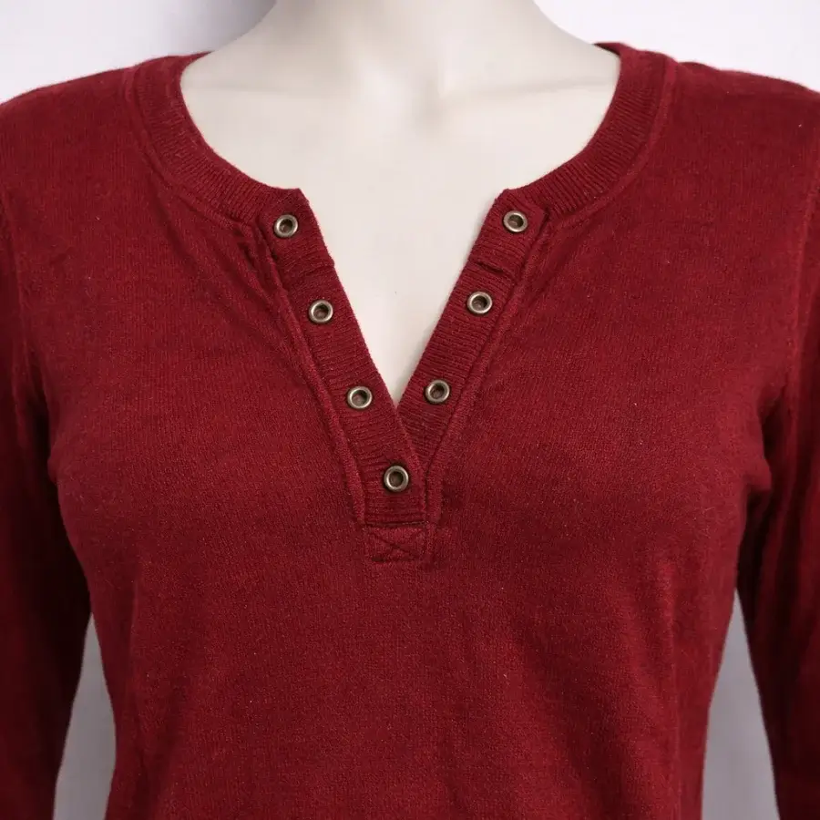 This is a GUESS women’s long sleeve shirt in size large. It has a burgundy color. The V-neck has small button details that are well intact. The fabric feels soft and comfortable. It is good for daily wear and casual outfits.