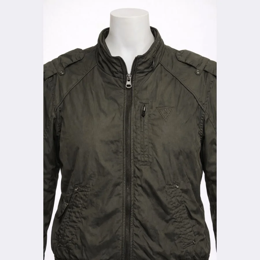 This is a GUESS women’s zip-up jacket. It is in large size. It comes in an olive green color. It has a full zip at the front that makes it easy to wear. The fit is comfortable and light, which makes it stylish. It is good for daily wear and mild weather.