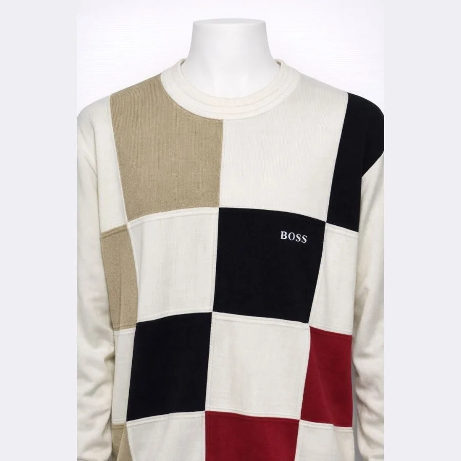 This is a HUGO BOSS men’s casual sweater. It has a patchwork-style design in mixed colors. The crew neck gives a clean look. The fabric feels soft and comfortable. Good for daily wear and casual outfits.