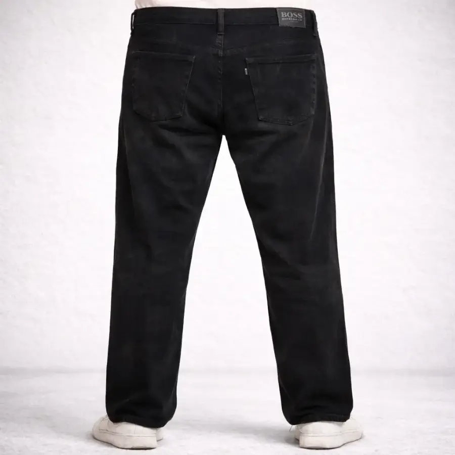 HUGO BOSS Men’s Jeans Pant are sleek black denim jeans with a tailored fit. It has a deep black color for a modern look. It is made from high-quality denim fabric. It has a sharp fit that looks neat and stylish. It has a classic five-pocket design. It shows subtle HUGO BOSS branding. It is original and used but clean.