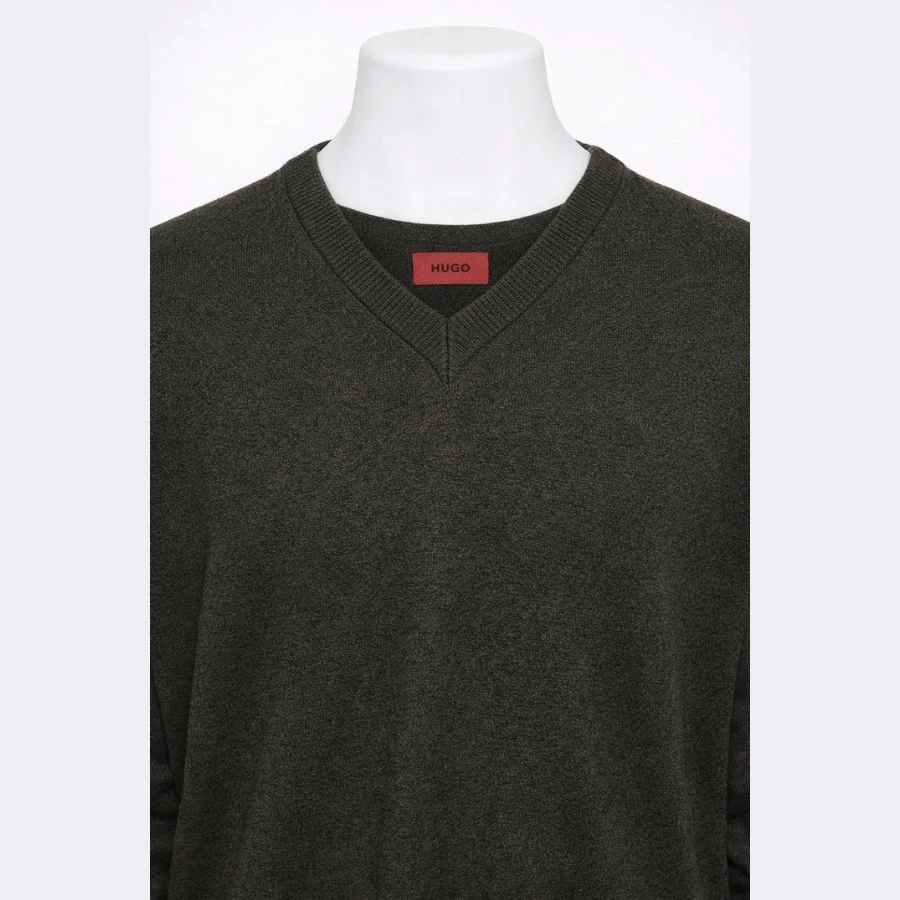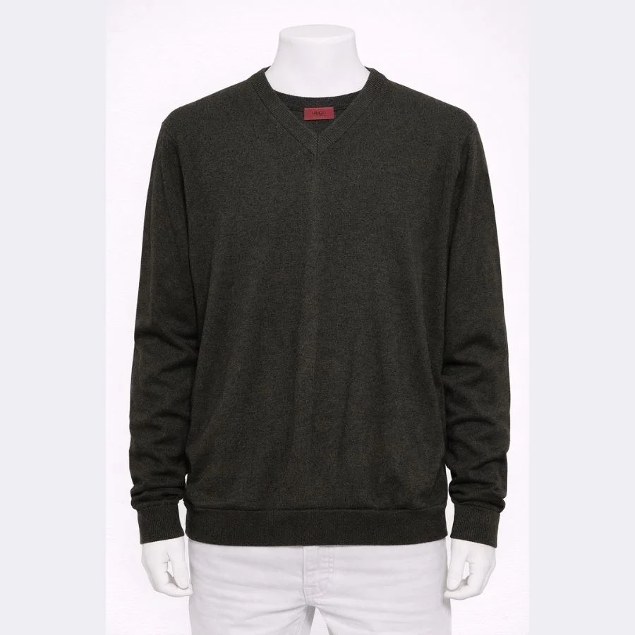 HUGO Men’s V-Neck Sweater is olive-brown in color. It looks simple and neat. It has a V-neck for easy layering. It is made from light, soft fabric. It feels comfortable to wear. It is good for daily or office use. It is original and used but clean.
