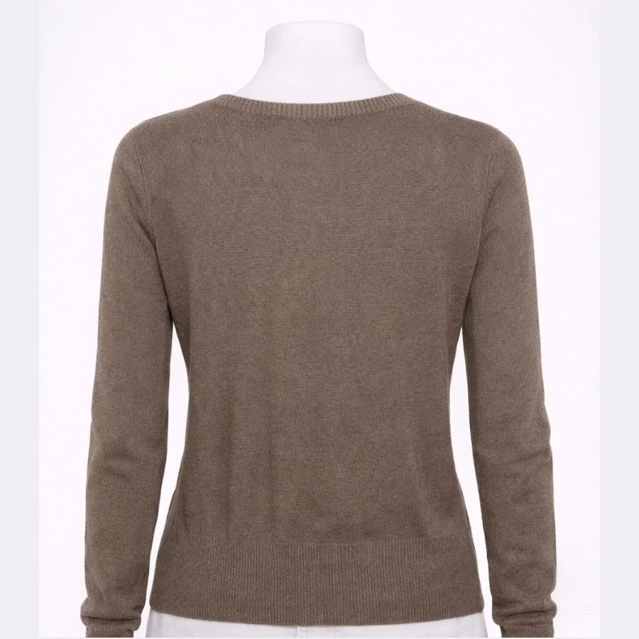 This is a LIU JO women’s knit sweater in a small size. It comes in a soft taupe color. The cable knit detail adds a neat look to the sweater. The fit is slim and comfortable. It is good for daily wear and cool days. It is made of comfortable, soft fabric.
