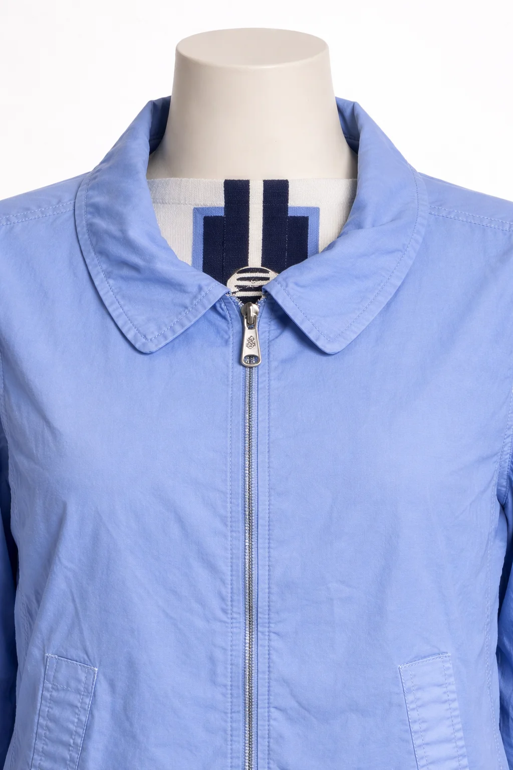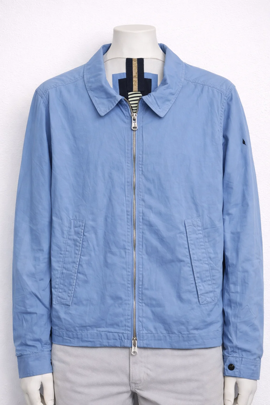 This MARINA YACHTING Blue Jacket is a light blue jacket with a simple style. The light blue color looks fresh and clean. It has a full zip and a high neck to block wind. It has side pockets for small items. It is light and comfy for cool days. It is original and used but clean. It goes well with jeans or trousers.