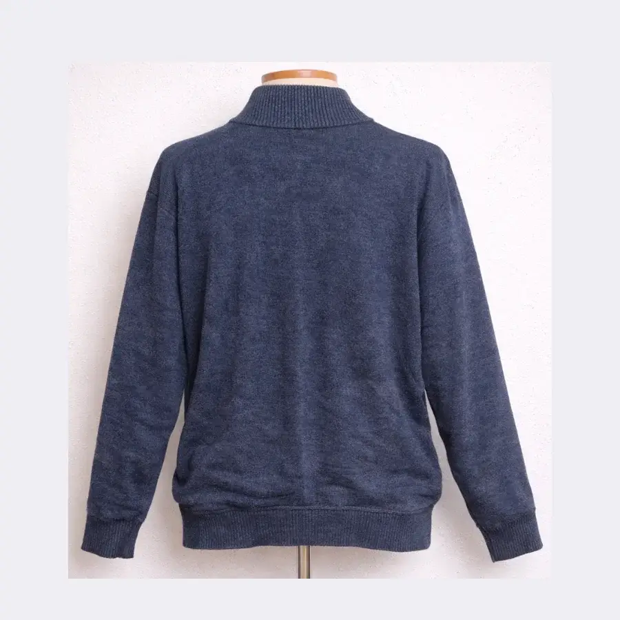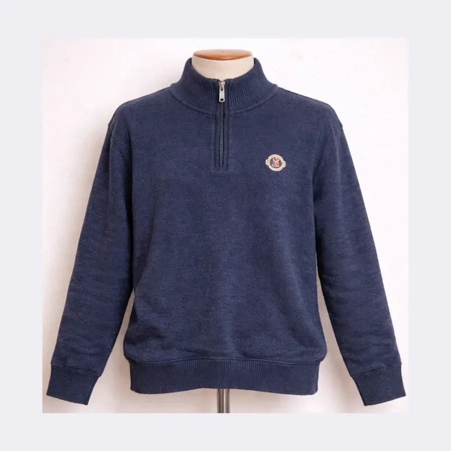 MONCLER Half Zip Sweater has a premium and elegant look. It comes in a classic navy blue color. It has a stylish half-zip design for easy wear. It is made from soft and high-quality fabric. It has a MONCLER logo on the chest. It feels warm and comfortable. It is original and used but clean.