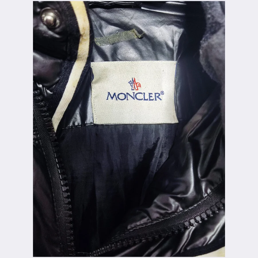 This is a MONCLER shiny black hooded jacket in XL size. It has a sleek and glossy look. The full zip makes it easy to wear. It has front pockets and a warm hood. It is good for cold days and winter wear. It is made from a premium fabric leather look, but not in leather.
