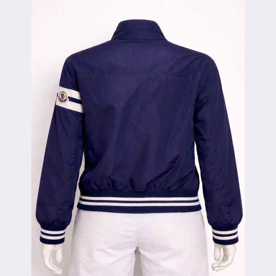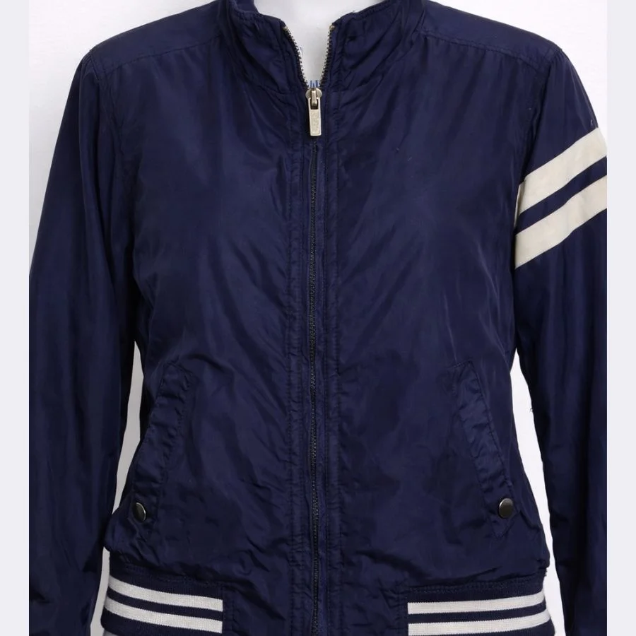 This is a MONCLER women’s full zip jacket in medium size. It comes in a deep navy blue color. It has white stripes add a sporty look. It feels light and comfortable to wear. It is good for daily wear and casual outings. The Jacket has a full zip, which works properly.
