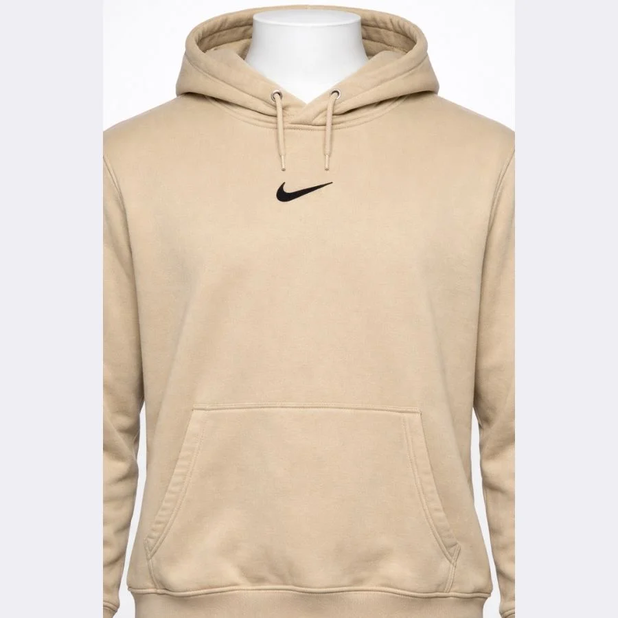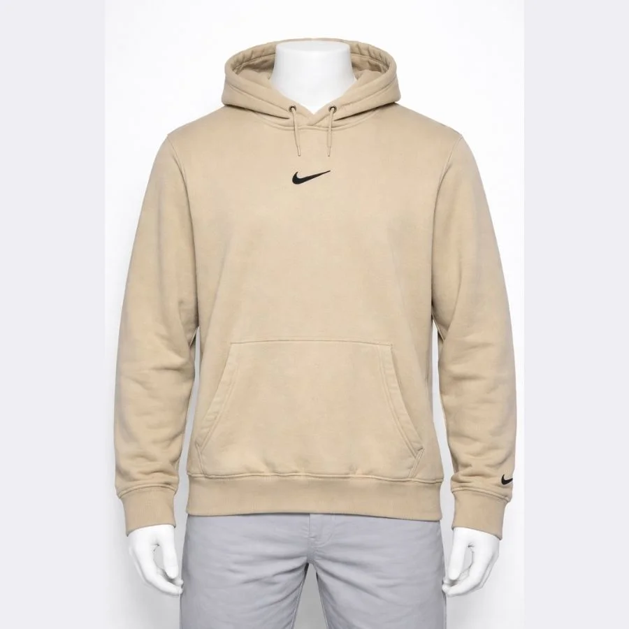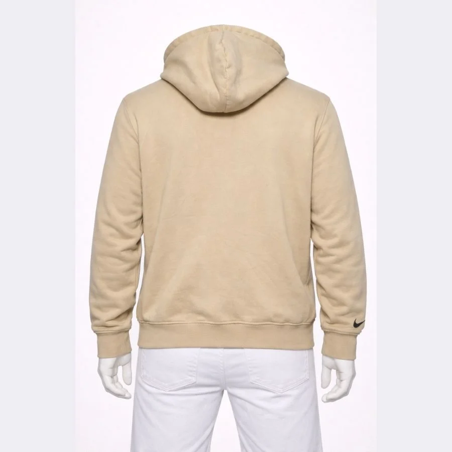 This beige Nike hoodie has a very simple and clean style. It features a small black Nike swoosh right in the middle. It feels soft and is very comfortable for every day. It shows a little use but still looks great. It is perfect for casual days or just relaxing. It has a nice neutral sand color that goes with everything.