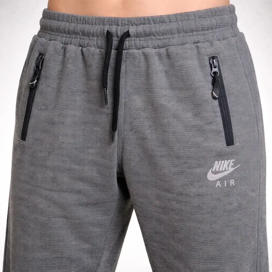 This Nike Sportswear Trouser for Men is a grey trouser with a sporty look. It feels soft and comfy to wear. It has a string waist for a good fit. It has zip pockets to keep things safe. It has a Nike Air logo on it. It is original and used but clean.