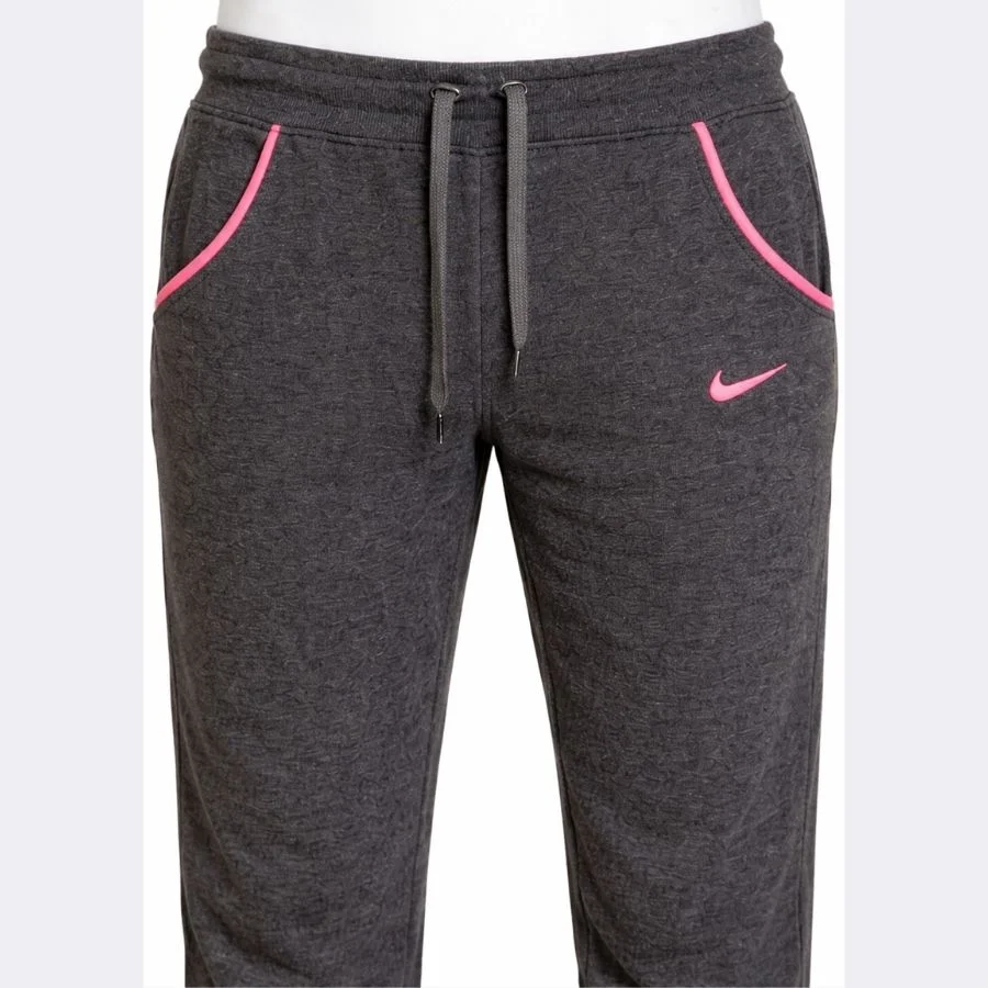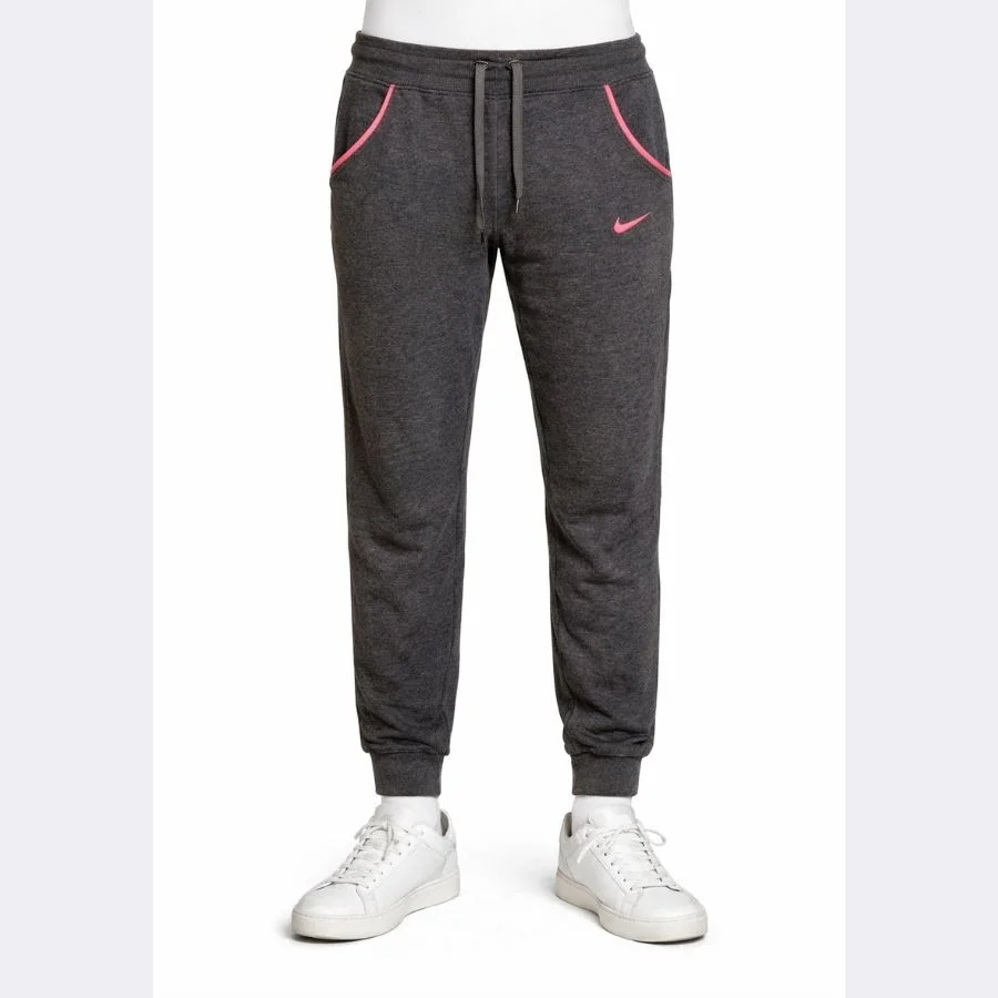 This is NIKE women’s sweat pants in medium size. They come in dark grey with pink details. The waist has elastic and a drawstring. The fit is comfortable and neat. It is good for workouts and daily wear.