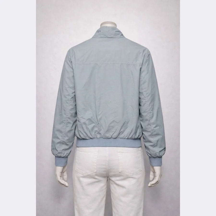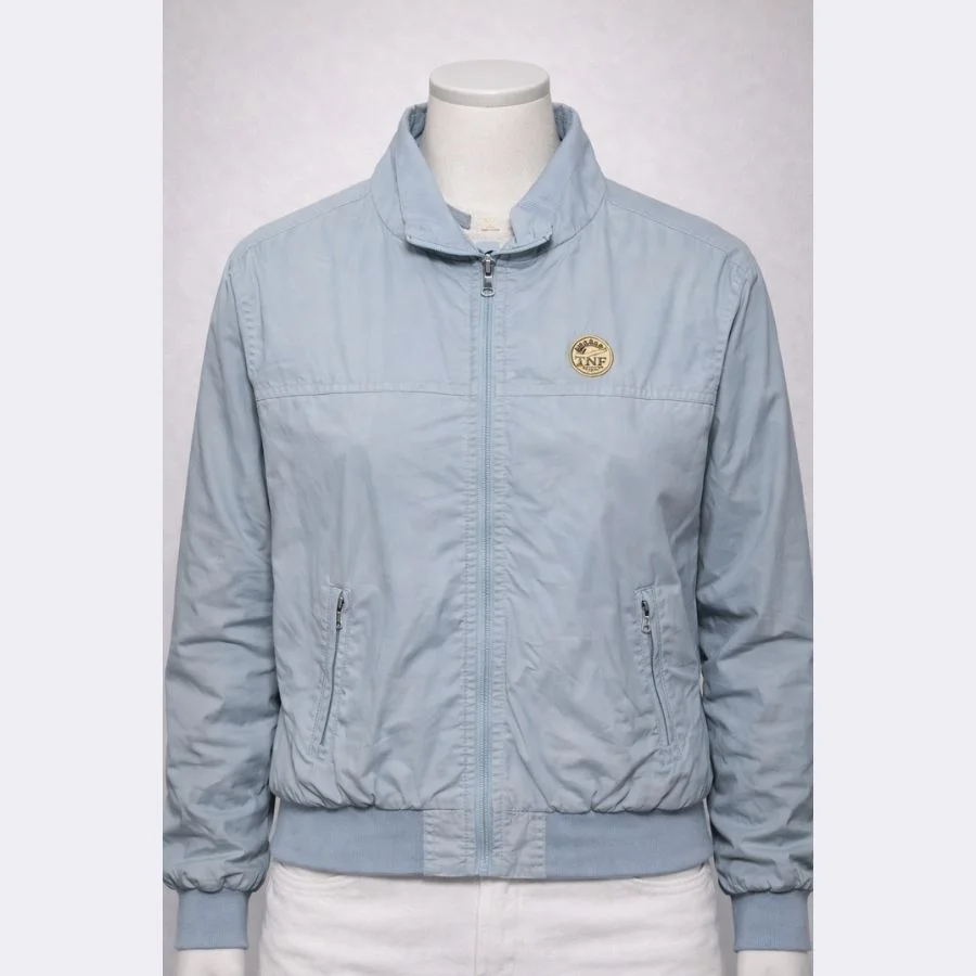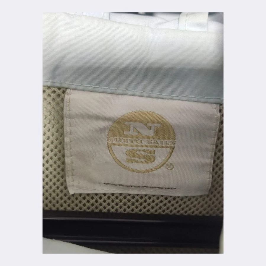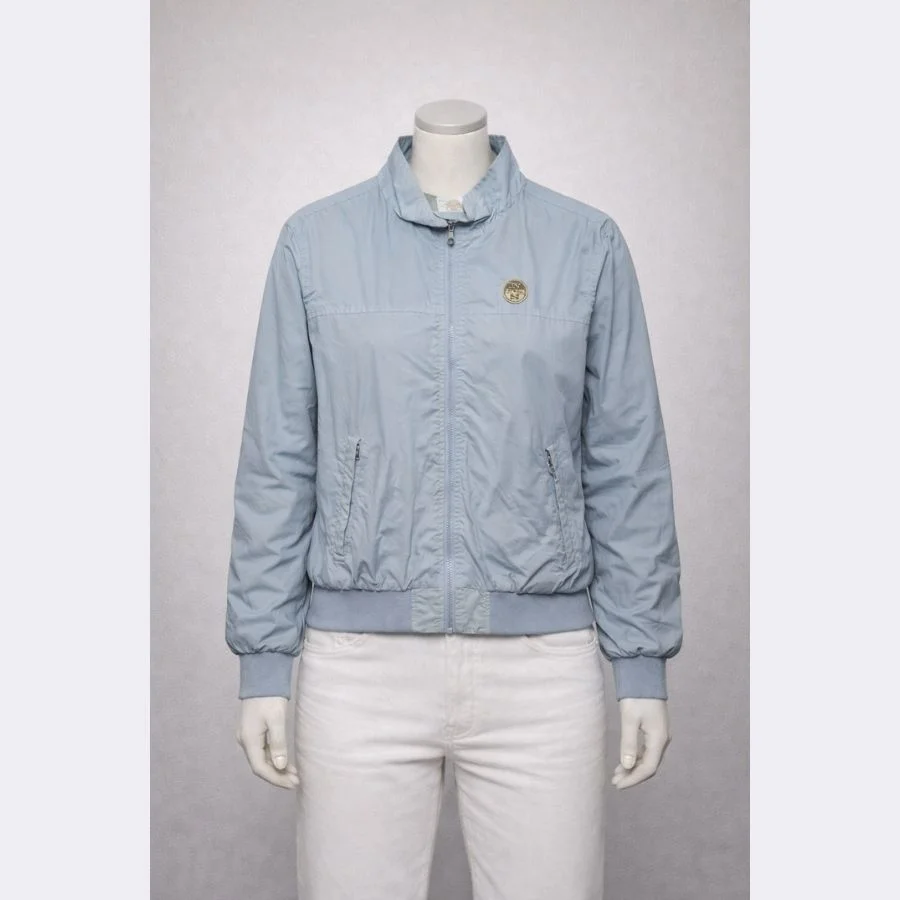 This light grey jacket has a clean, simple look for everyday wear. It has a subtle North Sails logo badge on the chest. The stand collar and elastic cuffs help protect against light wind. It is an original piece, kept in very good and clean shape. A simple design that looks great with jeans or casual trousers.