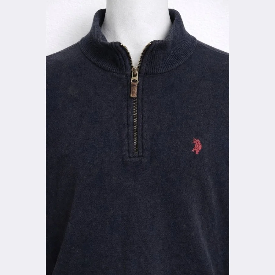 POLO Men’s Half-Zip Sweater comes in a clean navy blue color. It has a deep navy tone that looks simple and stylish. It features a stand collar with a half-zip for easy wear. It has a small red embroidered logo on the chest. It includes ribbed cuffs and hem for a neat fit. It is original and used but clean. It is great for office-casual wear or weekends.