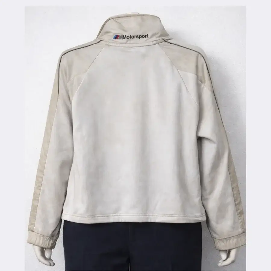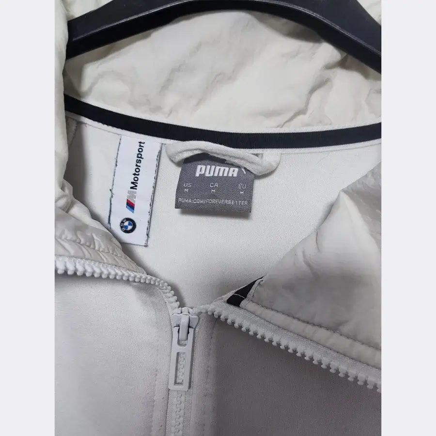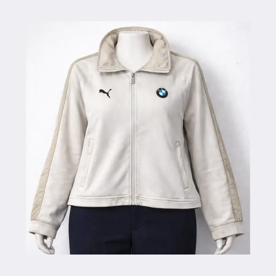This is a PUMA BMW Motorsport sweat jacket. It comes in a fresh white color. The BMW logo is on the chest, and the PUMA logo is on the shoulder. The fabric feels soft and easy to wear. The full zip makes it simple to put on. It is good for everyday use and casual days.