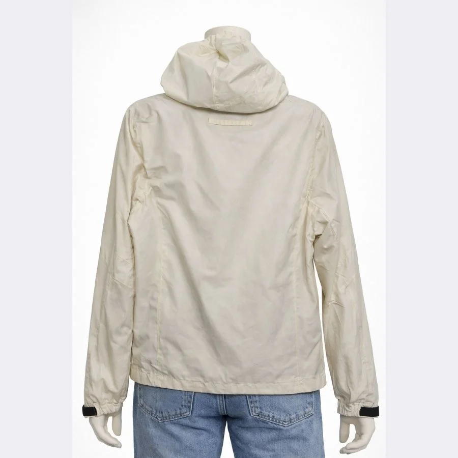 This is a Sergio Tacchini women’s track jacket in size large. It’s a sportswear track jacket. It comes in an off-white color. It has a full zip at the front. The hood is adjustable. It is good for casual wear and light activity.