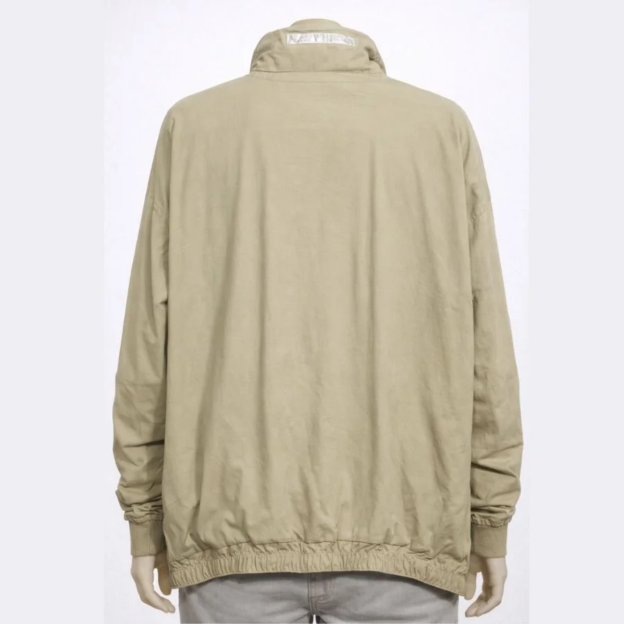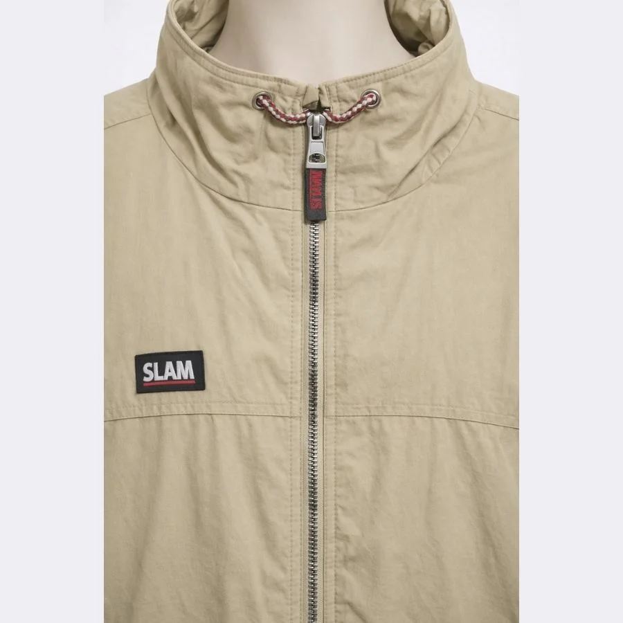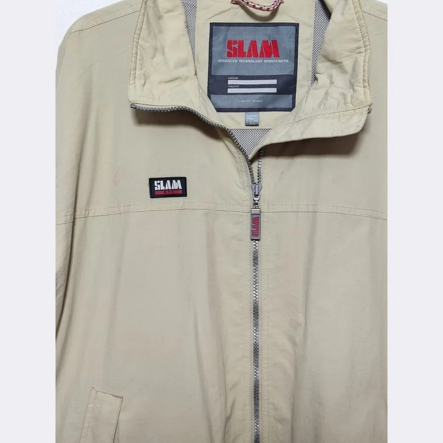This SLAM Zipper Jacket is a beige jacket that is light and comfy. It has many pockets to keep small things safe. It has a high neck for extra cover. It is easy to wear for daily use. It is original and used but clean. It is good for outdoor wear, travel, or casual trips.