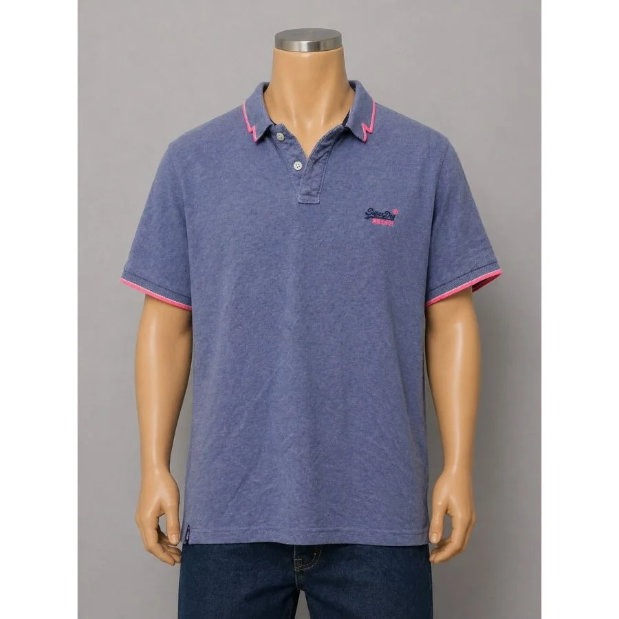 This Superdry men’s polo shirt features a blue color with small chest logo for a clean look. It has a classic collar with button placket. Pink trim on collar and sleeves adds a stylish touch. Made from soft, breathable fabric for all-day comfort. Easy to wear with jeans or chinos.