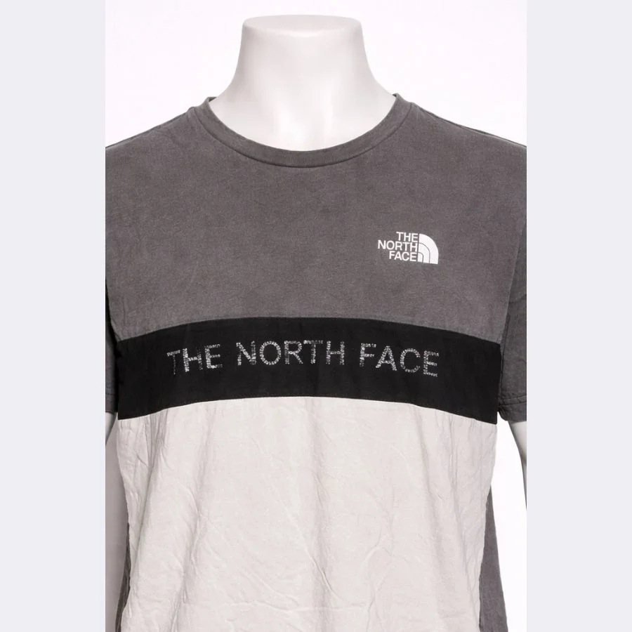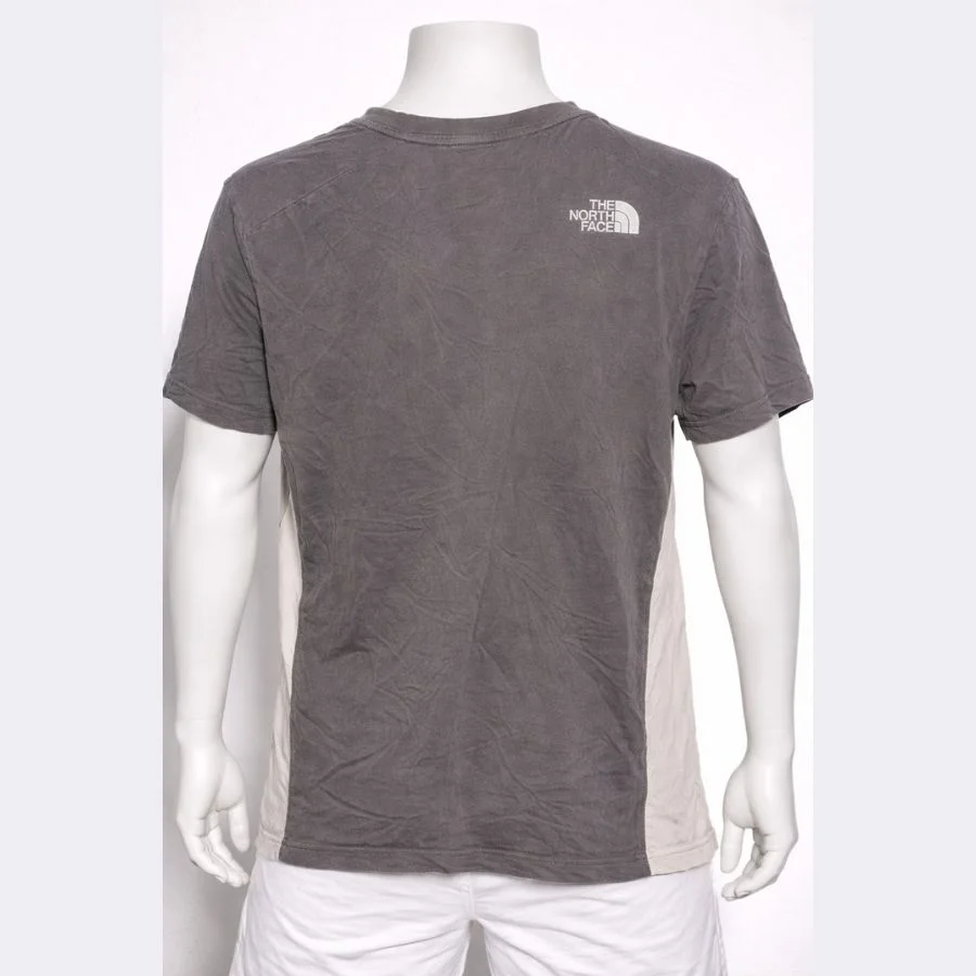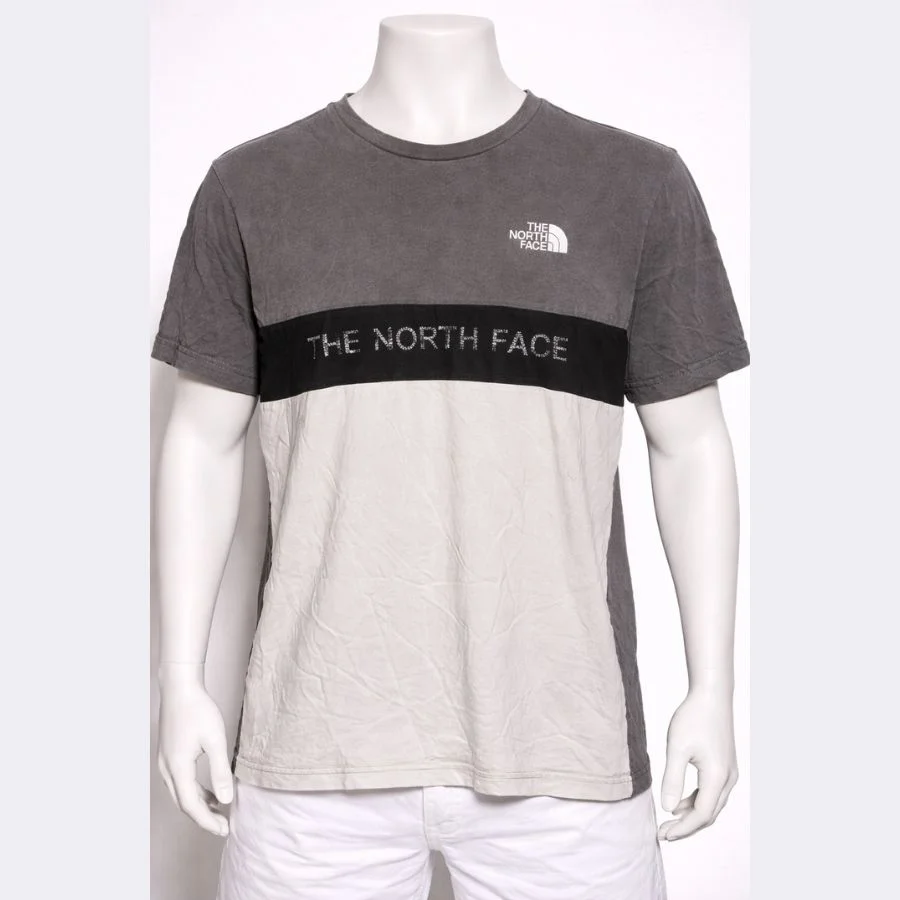This is a The North Face men’s t-shirt in medium size. It comes in a grey and white colorblock design. The North Face logo is printed on the chest and across the front. It has a classic crew neck style. The fabric feels soft and comfortable. It is suitable for casual wear and outdoor style.