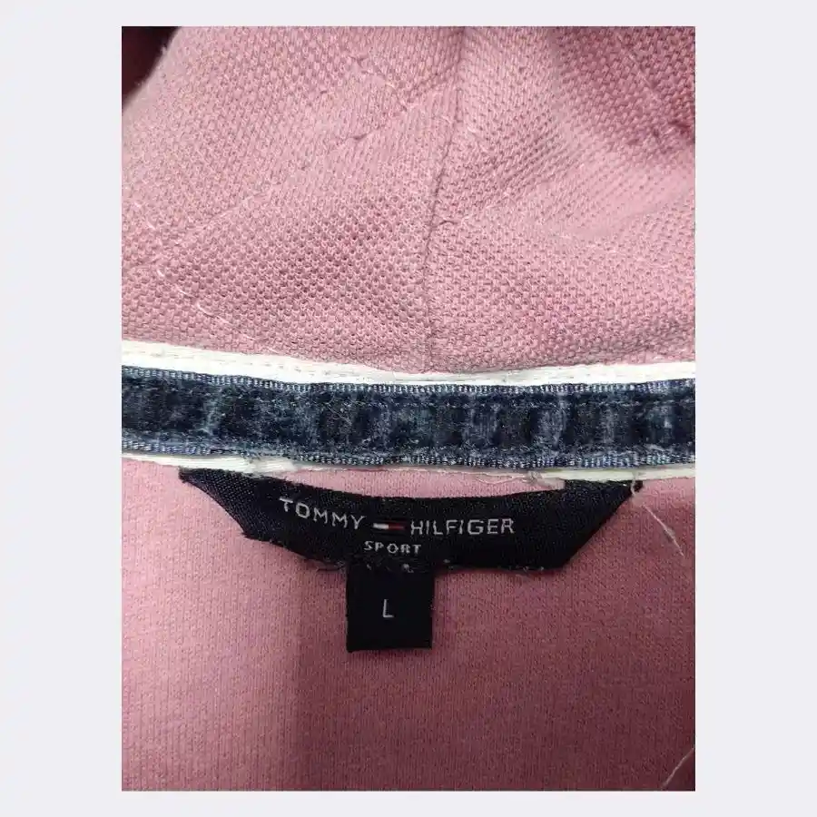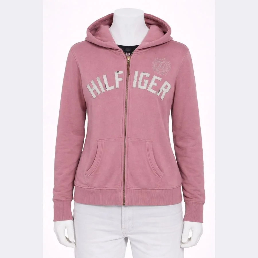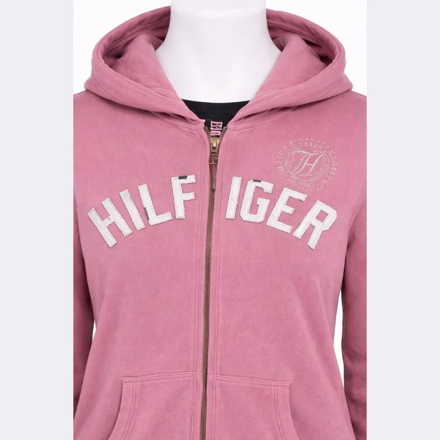 This lady’s full zip hoodie from Tommy Hilfiger is in a large size. It is made of a cotton blend. It offers comfort and casual style. It is in a soft dusty pink shade. It features classic branding on the chest that gives a recognizable look.