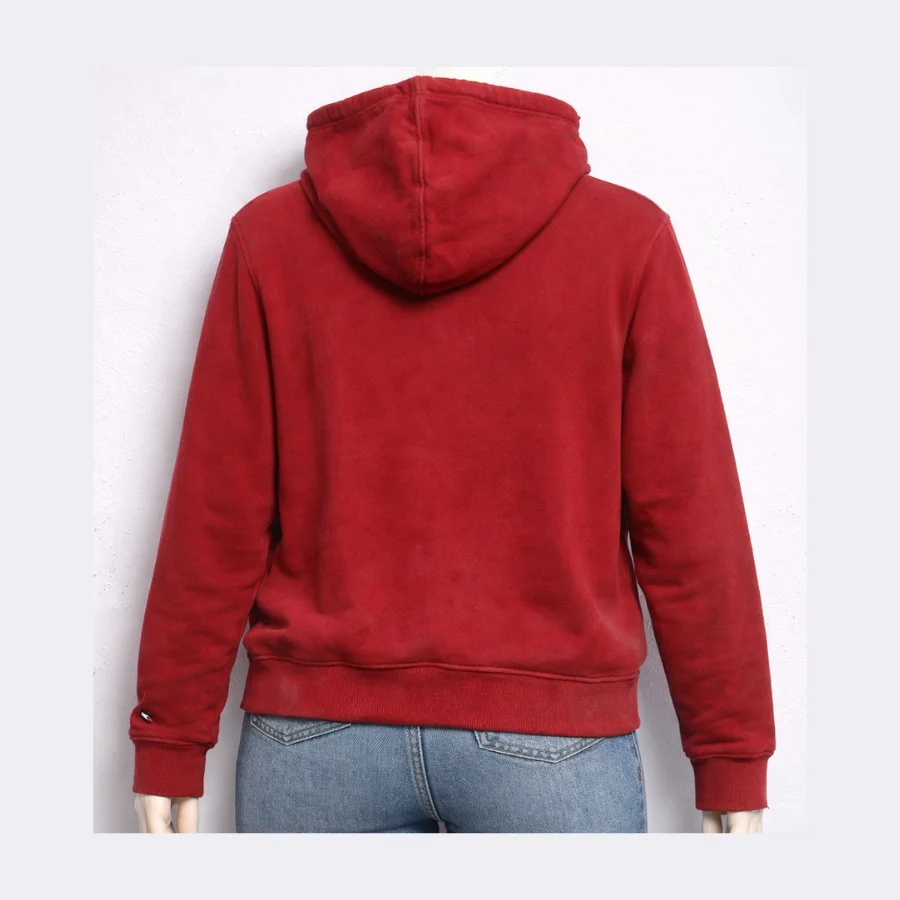 This TOMMY Red Hoodie in medium size offers casual comfort wear. The TOMMY HILFIGER logo is featured across the chest. It is easy to wear every day. It is made from soft cotton for comfort and warmth. It has a front pocket and a hood with strings. It is good for daily wear and relaxed weekends.
