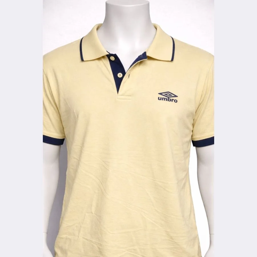 This is an Umbro men’s polo shirt in large size. It comes in a light yellow color. The Umbro logo is on the chest. It features a classic collar with button placket. The collar and sleeves have dark contrast details. The fabric feels soft and comfortable. It is suitable for casual wear and everyday use.