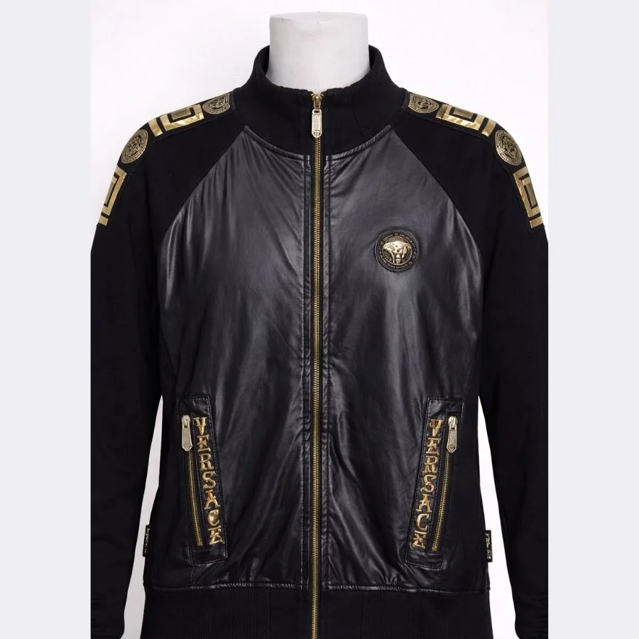 This black Versace jacket delivers a bold, luxury look for streetwear fans. It is designed with iconic gold accents to make a real fashion statement. It has a full-zip front that makes it easy to style for formal events. It is made with a comfortable fit. It has original brand quality in a fresh condition. It is a unique designer item that looks great with simple black or white pants.