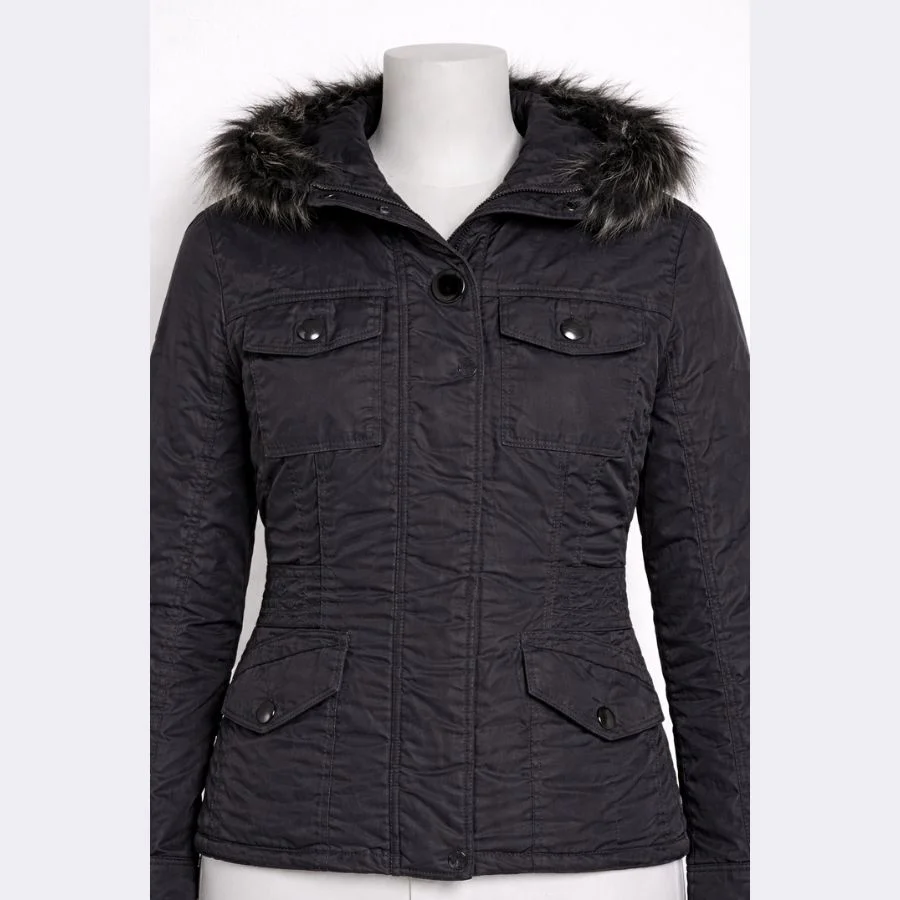 This is a WOOLRICH women’s hooded jacket in size small. It has a classic black color. The quilted design of this WOOLRICH Jacket helps keep you warm. The hood has fur for extra protection and warmth. It is best for winter wear and daily use.